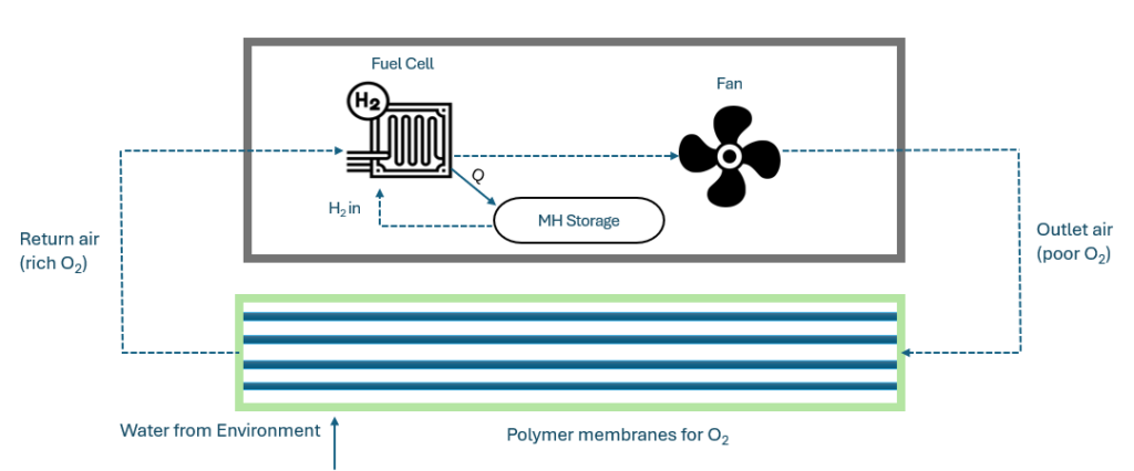 The key novelty of this approach is, however, the development of an oxygen supply system that resembles the function of gills. This artificial gill system uses membranes that separate the ambient water phase and the internal gas phase, allowing oxygen to diffuse through the membrane, enriching the gaseous phase with oxygen. A circular gas flow then transports the oxygen-enriched gas to the fuel cell and returns the subsequent oxygen-depleted gas to the artificial gill system for it to be replenished again.