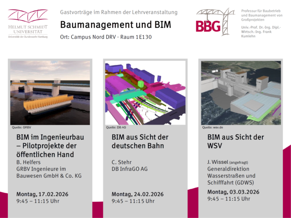 Der Themenbereich Building Information Modeling (BIM) ist seit Jahren ein Fundament der Digitalisierung im Bauwesen. Um den Studierenden ergänzend zu den theoretischen Grundlagen die praktischen Vorteile, Erfahrungen und Herausforderungen im Umgang mit dieser Methode in der Lehre näher bringen zu können, findet im Rahmen der Lehrveranstaltung „Digitale Bauwerksmodellierung I (Baumanagement und BIM) regelmäßig eine Gastvortragsreihe von Praxispartnern der Professur statt. Im Wintertrimester finden folgende Vorträge statt: