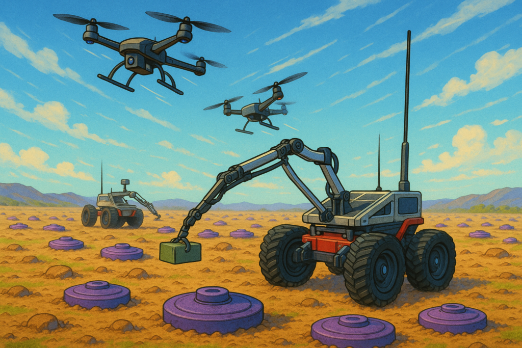 In the current phase of the project, a mine clearance scenario is being investigated in which drones and rovers must work together to clear a minefield. The AI-generated representation illustrates the scenario in which helicopters first survey the area from the air and the ground vehicles then approach the mines found in order to place a blast charge and render them harmless.