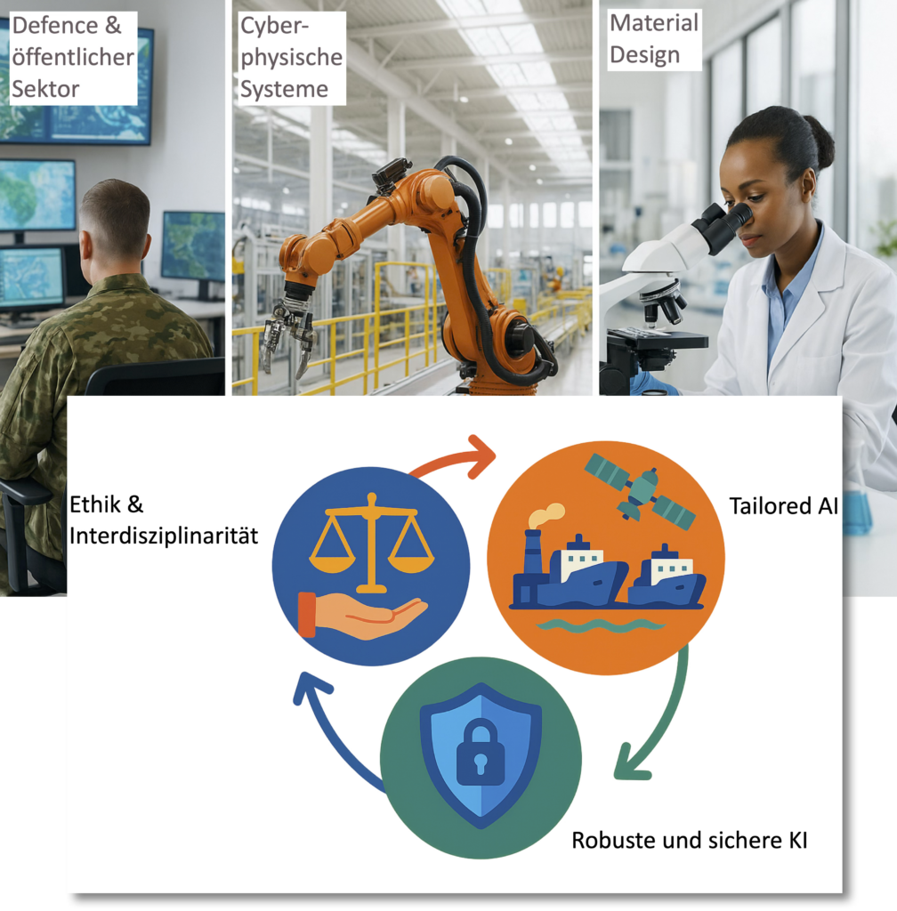 Der Schwerpunkt verbindet drei Anwendungsfelder mit drei Kernfragen der Algorithmik: Ethik und Interdisziplinarität, Tailored AI sowie robuste und sichere KI. Interdisziplinäre Teams aus Ingenieur-, Natur-, Sozial- und Rechtswissenschaften erarbeiten Entscheidungsunterstützung, Governance und transparente Modelle ebenso wie angepasste Algorithmen. So entstehen praxistaugliche Lösungen für hochregulierte Umgebungen, Dual-Use-Kontexte und wissensbasierte Domänen (physics-informed AI).