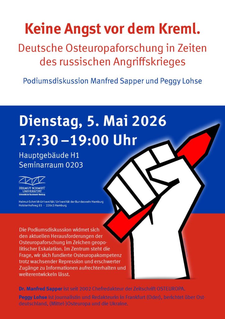 Die Podiumsdiskussion widmet sich den aktuellen Herausforderungen der Osteuropaforschung im Zeichen geopolitischer Eskalation. Im Zentrum steht die Frage, wir sich fundierte Osteuropakompetenz trotz wachsender Repression und erschwerter Zugänge zu Informationen aufrechterhalten und weiterentwickeln lässt.