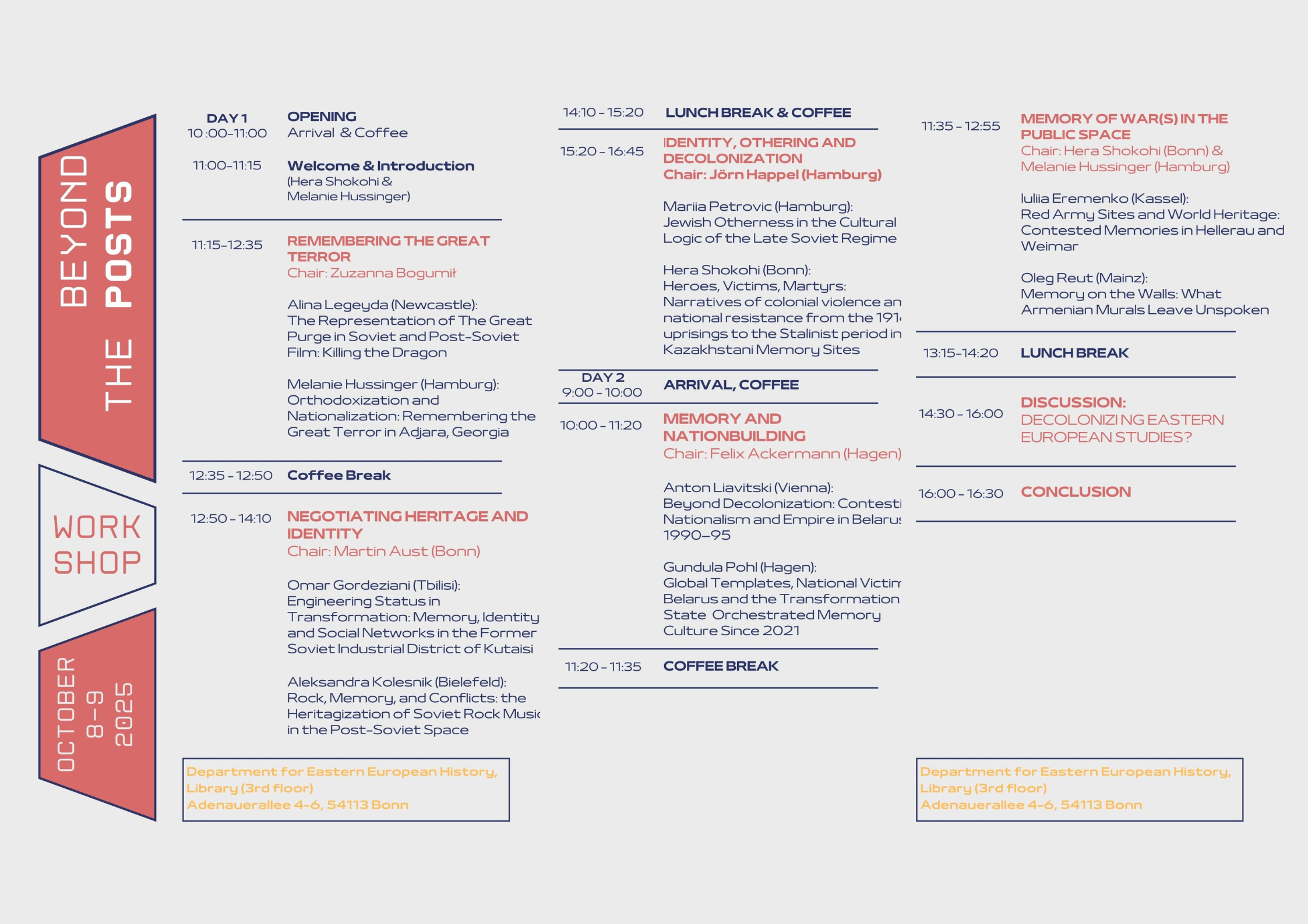 The interdisciplinary PhD workshop – jointly organized by the Department of Eastern European History at the University of Bonn and the Department for Eastern European History at the Helmut-Schmidt University Hamburg – explores the role of memory cultures and nation-building in the post-Soviet space through the lens of postcolonial and postimperial theory.