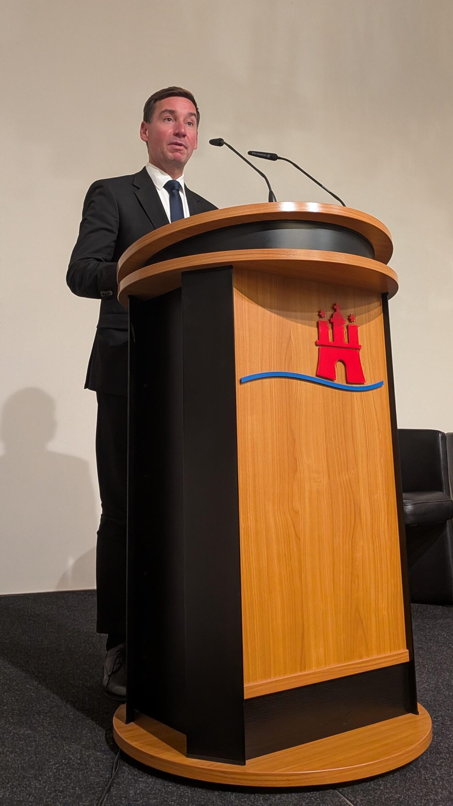 Der öffentliche Anteil des Netzwerktreffens in Form der Abendveranstaltung mit Paneldiskussion fand in der Landesvertretung der Freien und Hansestadt Hamburg statt. Nach einer Begrüßung und Einführung durch den Parlamentarischen Staatssekretär im BMVg, Sebastian Hartmann, folgte eine Paneldiskussion mit verschiedenen Perspektiven. Unter der Moderation von Frau Sophie Witte diskutierten PSts Hartmann, Staatssekretärin Claudia Elif Stutz (BMV) und Frau Karina Würtz (Stiftung Offshore) über die gemeinsame Verantwortung für die maritime Sicherheit Deutschlands. Im Mittelpunkt stand die Rolle von Politik, Abstimmungen zwischen Behörden und Wirtschaft sowie die Frage, wie maritime Sicherheit künftig ganzheitlich gedacht werden kann.
