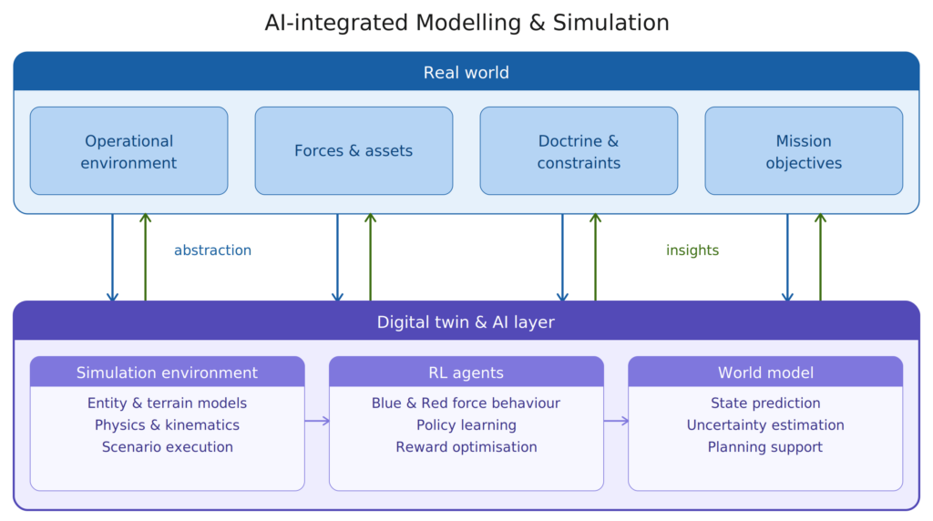 The foundation is a high-resolution modeling and simulation environment. Real-world elements—such as terrain, forces, doctrine, and mission objectives—are abstracted into a digital twin that can be executed at scale. Reinforcement learning agents operate within this environment and learn effective behaviors for blue and red forces. A world model captures the underlying dynamics of the operational space and enables robust state prediction as well as uncertainty estimation, forming the basis for planning.