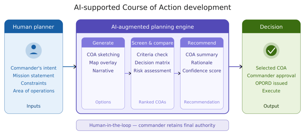 These simulation-based insights feed into course-of-action development. An AI-supported planning system generates, evaluates, and compares courses of action based on mission criteria. The system provides prioritized options with explanations, enabling human oversight, while the commander retains final decision authority.
