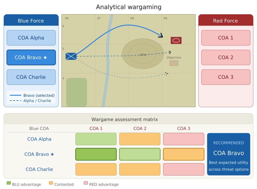 The selected course of action is then tested in an analytical wargame. Blue and red options are played against each other in a structured force-on-force execution, producing an evaluation matrix. The result is a transparent, evidence-based recommendation that serves as the basis for the order.