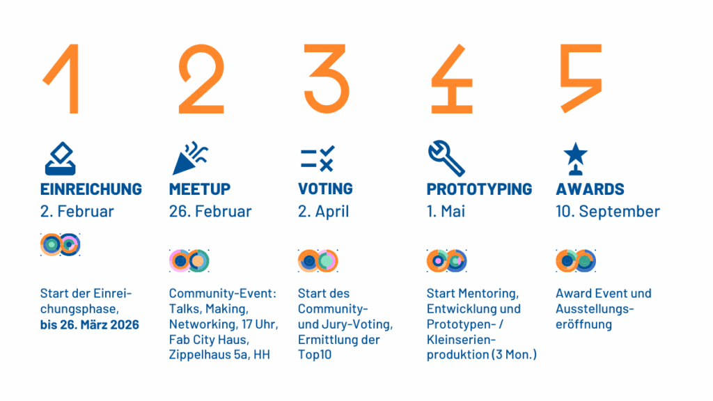Zu gewinnen gibt es Mentoring und 10x je bis zu €1.000 Materialkostenzuschuss sowie Zugang zu lokalen Werkstätten für die Prototypen- oder Kleinserienproduktion. Das Hamburger “Fabrication City Netzwerk” umfasst 22 Orte mit offenen Werkstätten und Bildungseinrichtungen. Zu unseren OpenLab Standorten gehören z.B. der HSU Makerspace, das MedTec Lab am Bundeswehrkrankenhaus, das Circular Plastics Lab beim Insel e.V. , der OpenLab Mobile Truck und die Microfactory im FABRIC.