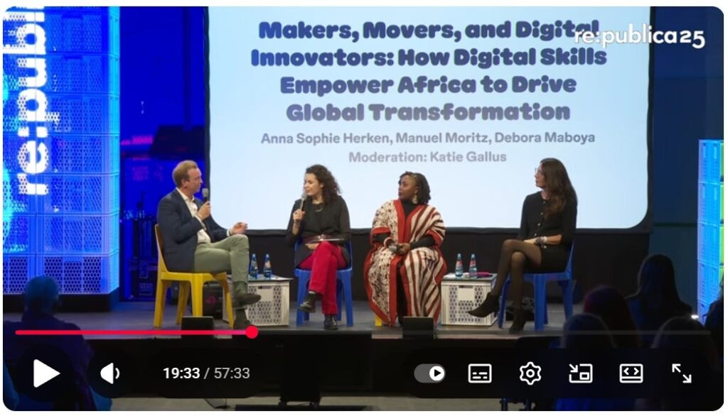Die re:publica 2025 stand unter dem Leitmotiv digitaler Transformation, Teilhabe und globaler Gerechtigkeit. Eines der inhaltlich dichtesten Panels war die Diskussion „Makers, Movers and Digital Innovators – How Digital Skills Empower Africa to Drive Global Transformation“, bei der unter anderem Anna Sophie Herken (GIZ)Debora Maboya (Makerin & Aktivistin)Manuel Moritz (HSU, LaFT, New Production Institute) sowie Moderatorin Katie Gallus Einblicke aus der Praxis, Entwicklungszusammenarbeit und Forschung gaben.