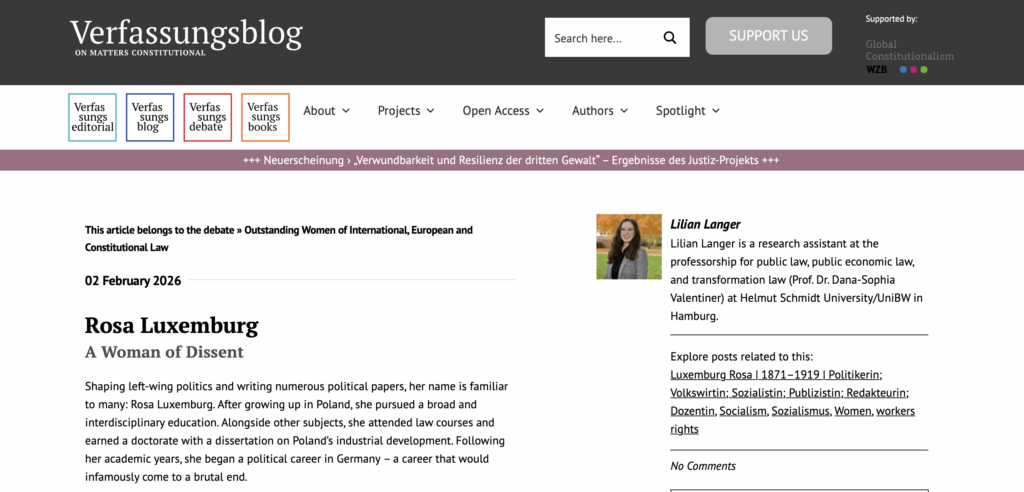 Im Rahmen des Projekts „Outstanding Women of International, European and Constitutional Law“ ist ein Blog Beitrag von Lilian Langer über Rosa Luxemburg auf dem Verfassungsblog erschienen. Das Projekt ist eine Initiative junger Wissenschaftler*innen und Studierender, die es sich zum Ziel gesetzt haben, das Werk und Wirken herausragender Juristinnen vorzustellen und ihre besonderen Beiträge zum Völker-, Europa- und Verfassungsrecht in der nationalen wie internationalen Rechtswissenschaft bekannt(er) zu machen. Zu diesem Zweck wird seit 2022 ein Kalender in englischer Sprache herausgegeben, der 12 Porträts mit Bildern, Zitaten und Kurzbeschreibungen bedeutender Frauen enthält. Ausführliche Darstellungen der Porträts sind in der Digitalversion des Kalenders auf dem Verfassungsblog einsehbar.