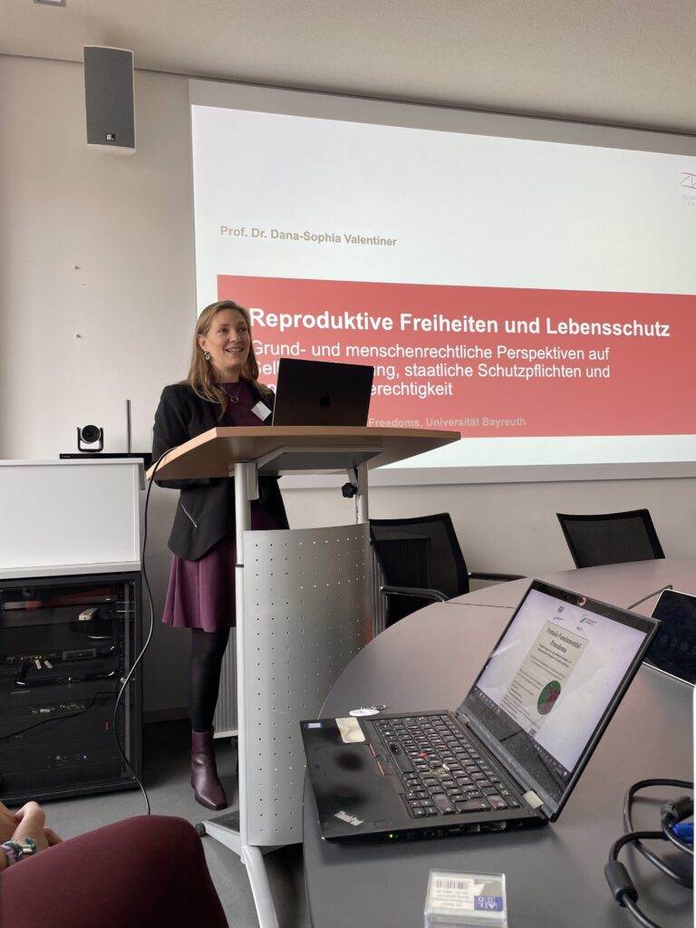 Prof. Dr. Dana-Sophia Valentiner hielt in diesem Rahmen einen Vortrag zum Thema: Reproduktive Freiheiten und Lebensschutz – Grund- und menschenrechtliche Perspektiven auf Selbstbestimmung, staatliche Schutzpflichten und reproduktive Gerechtigkeit.