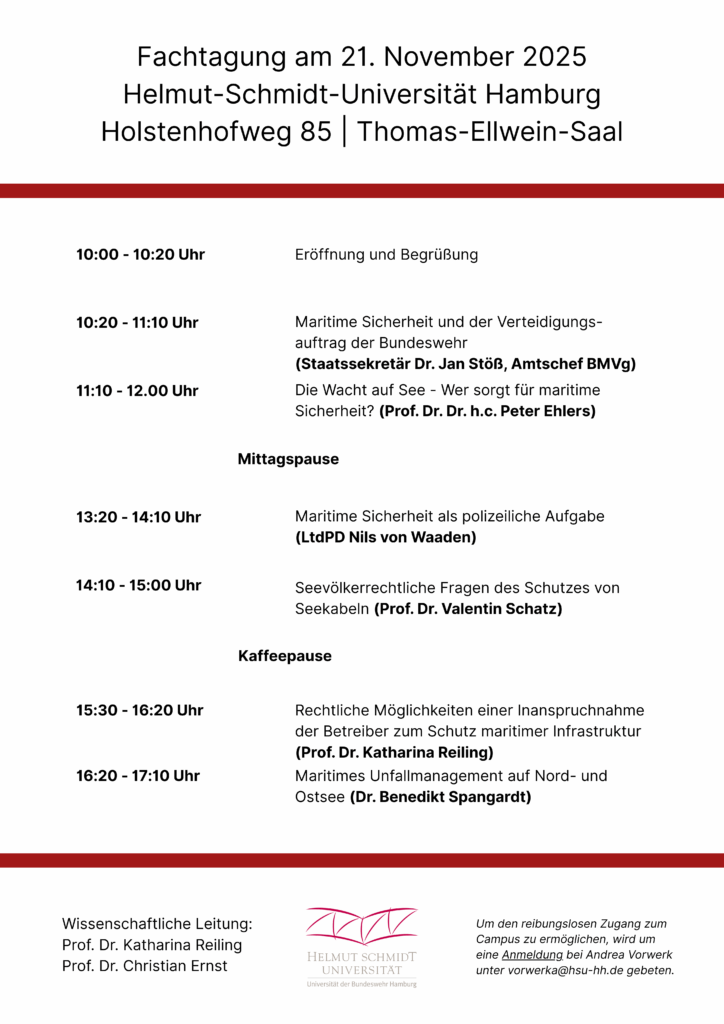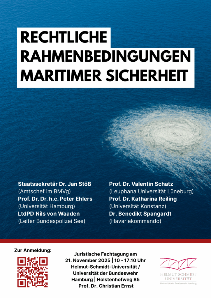 Am 21.11.2025 richten Prof. Dr. Christian Ernst und Prof. Dr. Katharina Reiling (Universität Konstanz) eine Tagung zu den rechtlichen Rahmenbedingungen maritimer Sicherheit an der Helmut-Schmidt-Universität / Universität der Bundeswehr Hamburg aus. Um den reibungslosen Zugang zum Campus zu ermöglichen, wird um eine Anmeldung bei Andrea Vorwerk unter [email protected] gebeten.