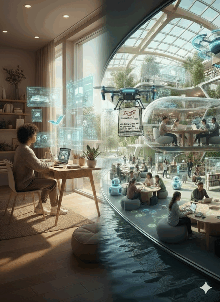 Empirische Ergebnisse des DigiTaKS-Projektes vergegenwärtigen zum anderen, dass Bibliotheken als Lernorte fungieren können, die durch eine starke Verwobenheit individueller Arbeitsplätze und öffentlicher Lernorte gekennzeichnet sind. Digitale Medien – vorwiegend Laptops und Smartphones – stellen ein Bindeglied zwischen den verschiedenen Bereichen dar, weil sie Orts- und Zeitgrenzen überwinden und den Abruf studienrelevanter Informationen ermöglichen. Flexibles Mobiliar, geschlossene und offene (Lern-)Bereiche entsprechen dem Wunsch einer einladenden Arbeitsatmosphäre und konzentrierten Arbeitens. Möglichkeiten an Informationsveranstaltungen in Bibliotheken können zum Verweilen und inspirierendem Weiterlernen einladen. Bibliotheksroboter und Hologramme übernehmen mehrere Funktionen: Transportaufgaben, Informationsvermittlung und Orientierungshilfen. Sollten dennoch Printmedien zum Lernen zu Hause präferiert werden, könnte – einer utopischen Vorstellung nach – eine Lieferung über eine Drohne den Bedarf stetig decken. Dadurch sind wissenschaftliche Bibliotheken nicht mehr an physische Orte und zeitliche Grenzen gebunden, sondern jederzeit betretbar, wodurch ein offenes Verständnis dieses Lernortes katalysiert wird.